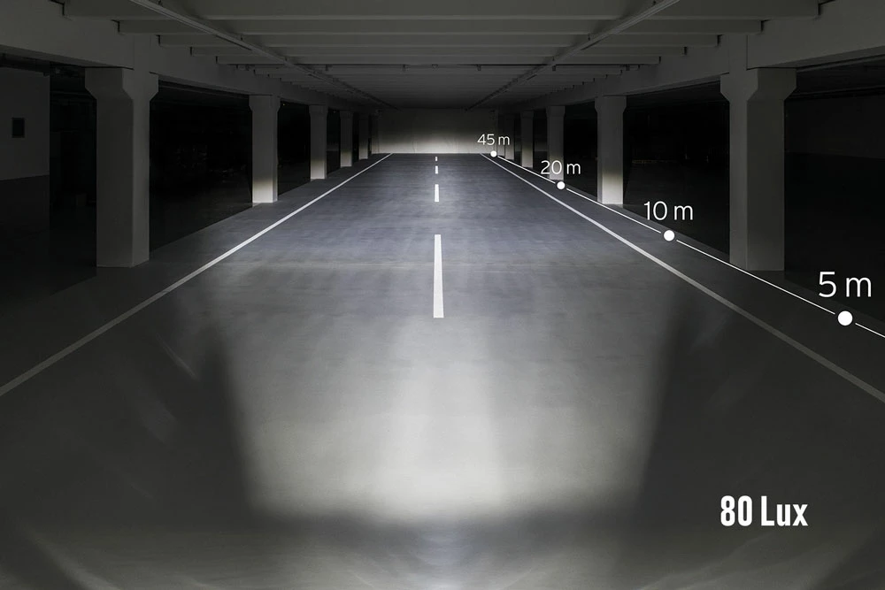 En mode croisement normal, le nouveau IQ-XM de Busch + Müller fournit une puissance exceptionnelle de 120 lux : le champ lumineux de grande surface éclaire de manière large, large et homogène, mais dispose, comme tout projecteur homologué pour la route, d’une limite claire/obscure précise. Une pression sur le bouton ergonomique du guidon permet de franchir cette limite : avec 170 lux, les feux de route éclairent vers le haut. Une visibilité énorme, un gain de confort évident.