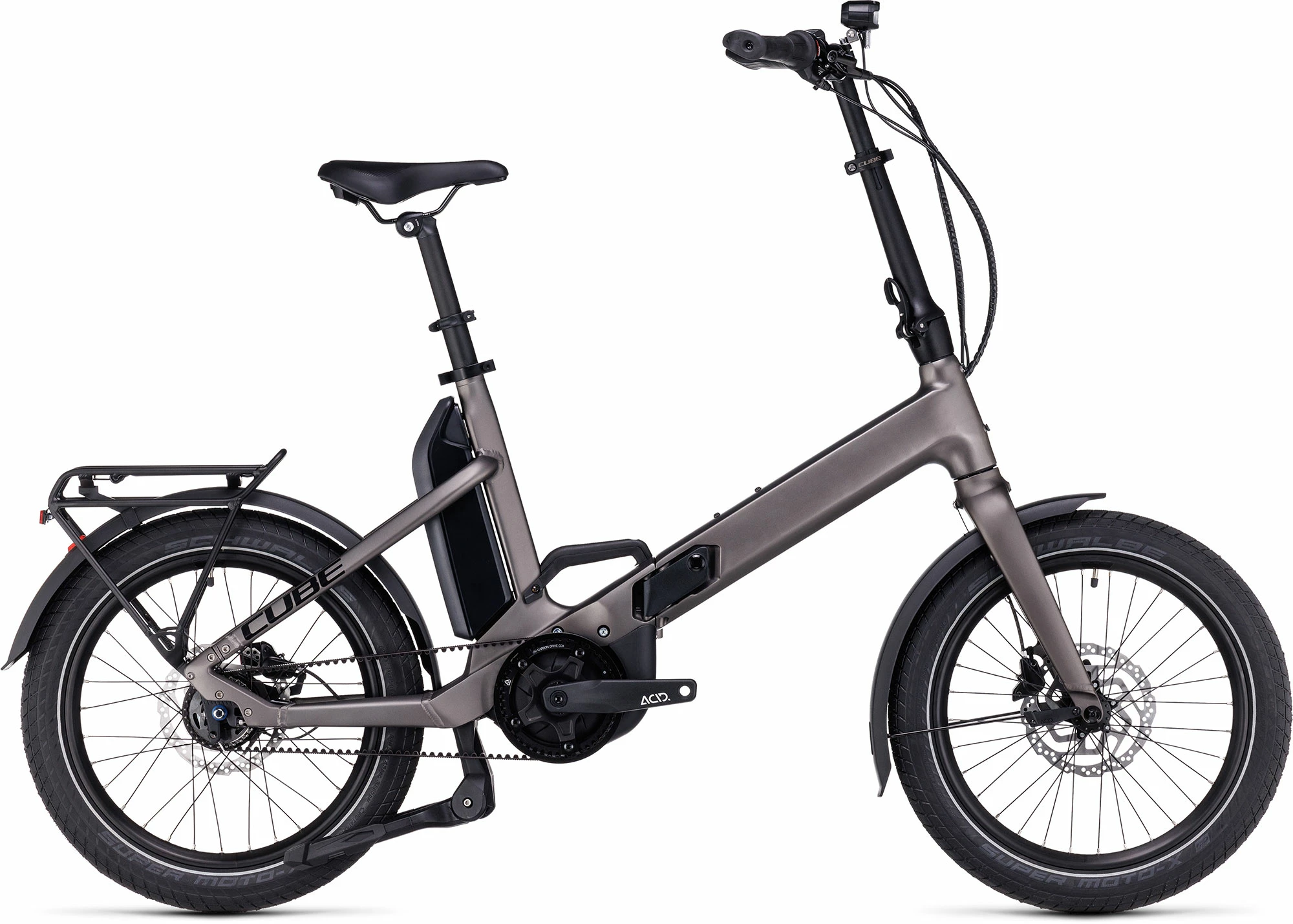 When CUBE set out to design their new foldable Bosch e-bike, they wanted it to set new standards for flexibility, mobility and functionality. The fact that it also looks great is no coincidence, because form often follows function. With its clever folding mechanism and integrated carry handle, the Fold Hybrid 500 is easy to store or transport in an efficient, space-saving size and shape. Simple saddle and handlebar adjustments mean it’s quick to set up for almost any rider height. CUBE has included mudguards, a really stable kickstand and a sturdy rear carrier. And an optional front carrier – plus a wide range of bags and baskets that attach quickly and simply via innovative mechanisms – make it simple to carry whatever you need along for the ride. You’ll wonder how you ever managed without it.