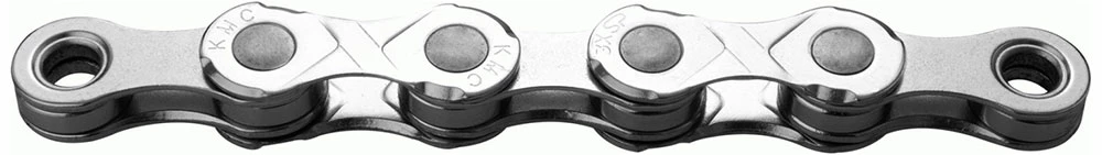 La chaîne KMC E10 pour e-bike avec surface nickelée et 122 maillons pour le moteur central d’un e-bike avec un levier de vitesse à 10 vitesses.